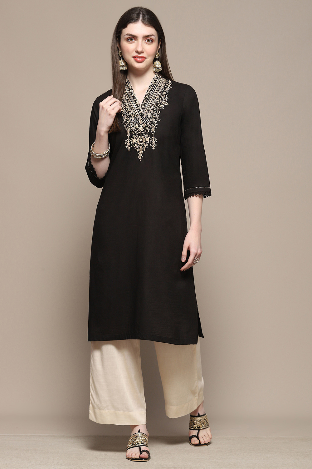 Black never goes wrong. Pick this floral thread work straight cotton kurta, featuring a V-neck, for daily outings & office days.