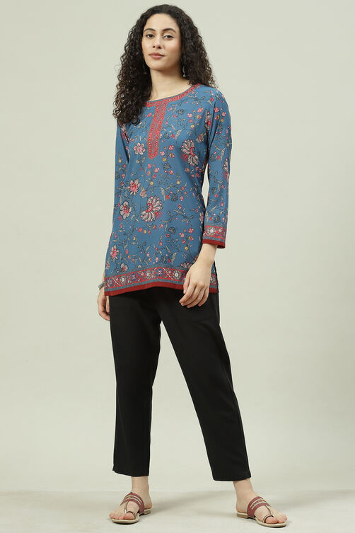 Blue Art Silk Straight Printed Short Kurti