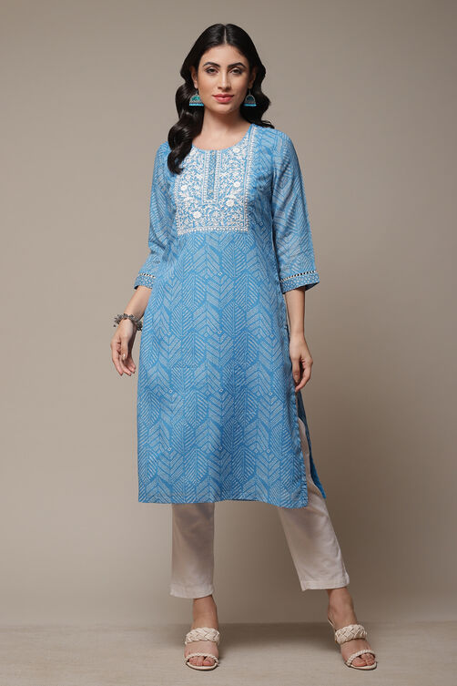 Infuse sophistication into your attire with this elegant straight-printed kurta. Crafted from a comfortable cotton blend, it features a round neck and three-quarter sleeves. The front of the kurta showcases buttons and floral embroidery work, while abstract prints adorn the entire garment. Pair it effortlessly with leggings or straight pants and accessorise with brass studs and T-strap flats for a versatile look suitable for work, errands, or casual shopping. Wash by hand in cold water using a gentle detergent.