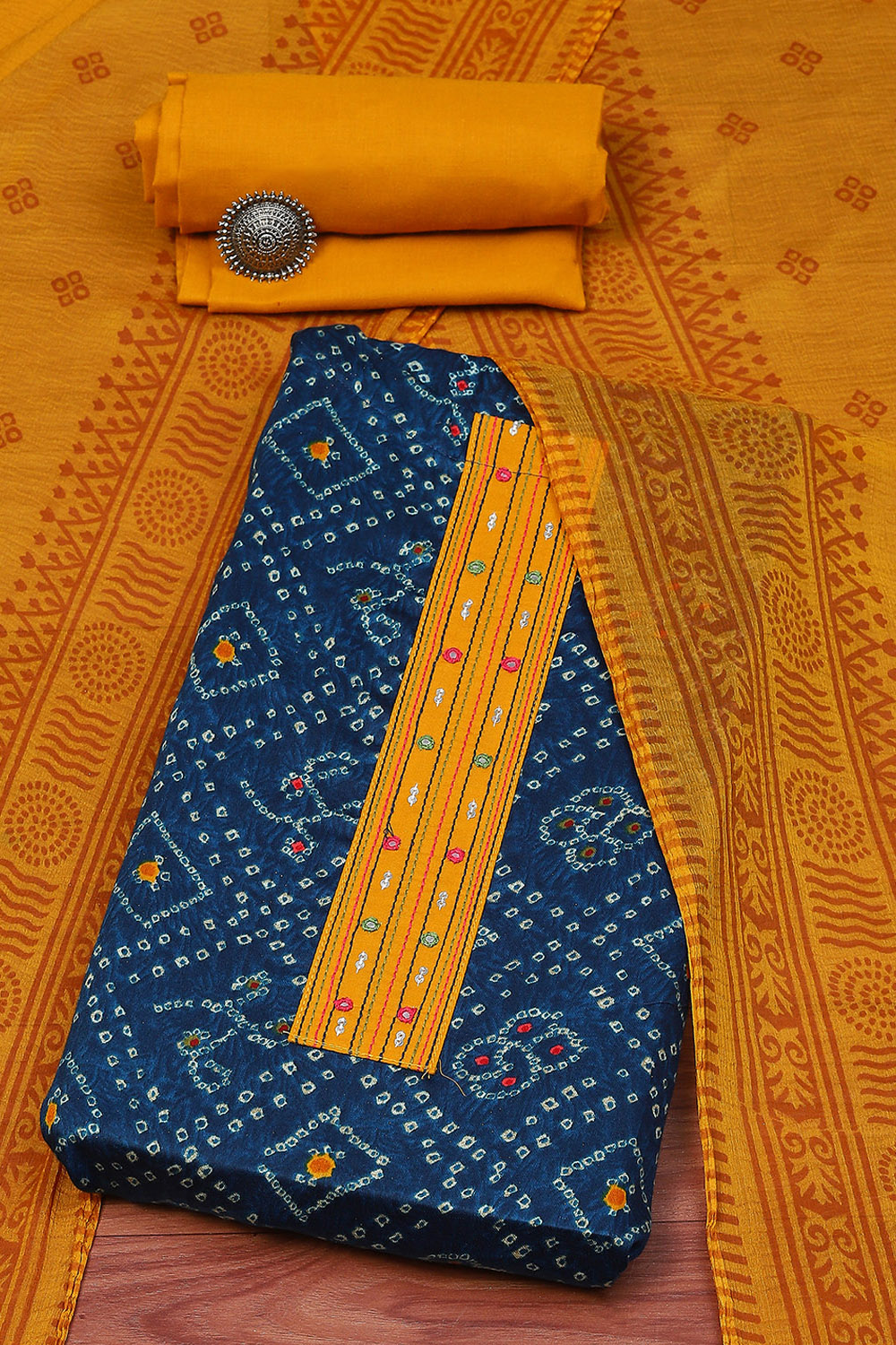 Elevate your spring-summer wardrobe with this printed blue satin unstitched suit set, complete with a chiffon dupatta.