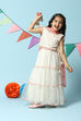 Bulit up your daughter's ethnic collection with this elegant short-top lehenga set, crafted from cotton fabric. The sleeveless top showcases a round neck adorned with delicate jari lace embroidery, which is also stitched at the hem. Geometric and dotted prints grace the rest of the top. The accompanying lehenga features a tiered pattern and a sheer look, complemented by tassels on the sides. Accessorise this ensemble with brass bangles and ethnic sandals for a complete and stylish look. Wash by hand in cold water using a gentle detergent.