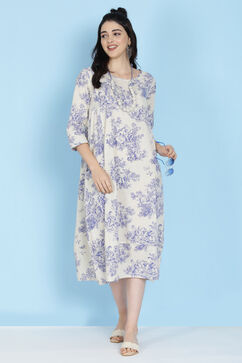 Off White Flared Cotton Printed Dress