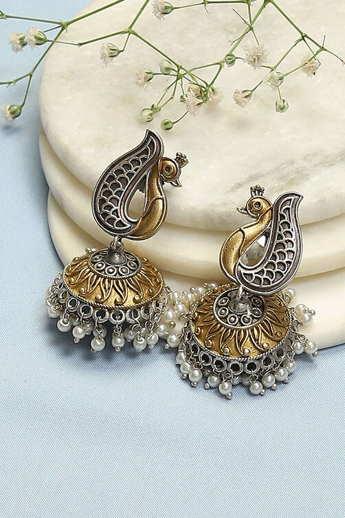Rejuvenate your aesthetic sensibilities with these dual oxidised brass earrings that showcase a magnificent peacock design at the top. Attached to it is an intricately designed jhumka charm, exuding elegance and grace. Completing the captivating look, small beads delicately adorn the ends of the earrings. Experience the revitalising allure of these earrings as they effortlessly combine artistic craftsmanship, cultural motifs, and timeless style.