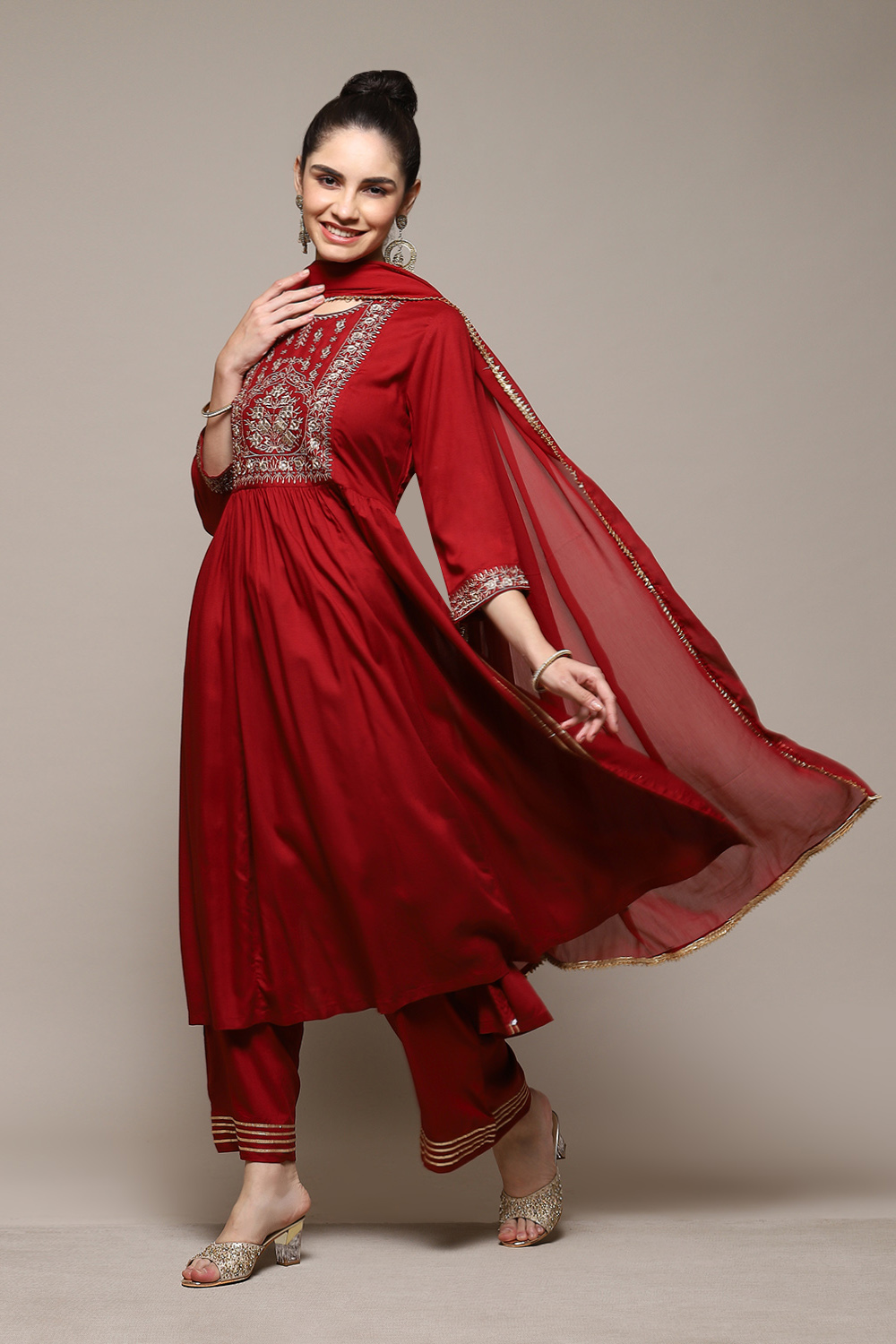 Introduce this effortlessly charming gathered kurta palazzo suit set, a must-have in your assortment, skilfully fashioned from rayon fabric. The kurta features a slitted round neck and three-quarter sleeves, with captivating ethnic embroidery adorning the front and sleeves. Its flared design adds a touch of grace. Paired with a palazzo adorned with zari borders and a dupatta featuring stitched zari lace, this set exudes elegance.