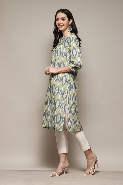 Refresh your workwear wardrobe with our green cotton straight Yarndyed kurta. This piece is designed for women seeking a blend of comfort and style in their professional attire. Made from soft, breathable cotton, it features an eye-catching abstract print in shades of grey and white, offering a modern twist to the traditional kurta silhouette. The straight cut and 3/4th sleeves ensure a sleek, professional look, ideal for busy workdays. Pair this versatile kurta with white trousers and silver earrings for a polished ensemble that transitions effortlessly from office to after-work engagements.