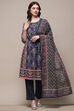 Step into the world of simplicity & elegance with this indigo & pink floral printed cambric straight suit set.