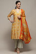 Vibrant mango yellow viscose straight suit set with floral prints, perfect for a sunny casual look.