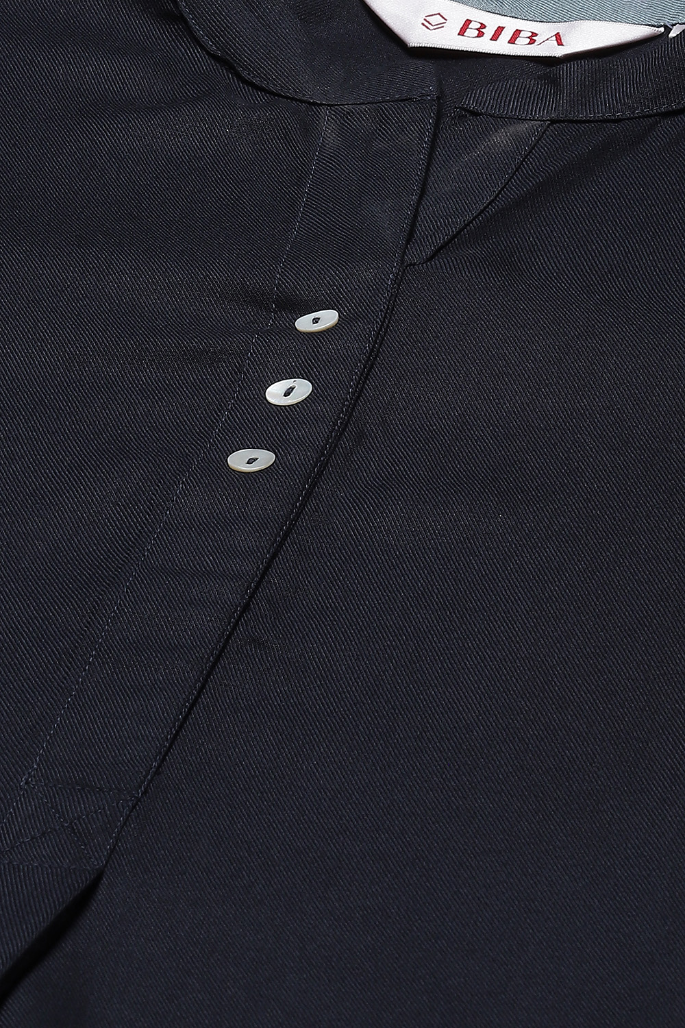 Add a fusion twist to your look with this navy kurta set from Biba. Crafted with natural-origin LIVA fabric, the set includes a straight fit kurta featuring shirt collar and three forth sleeves. Contrast printed pants and a scarf come along to complete your look.