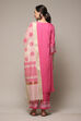 Diversify your wardrobe with this versatile straight kurta and narrow palazzo suit set. The kurta boasts a round neck and three-quarter sleeves, adorned with floral embellishments along the border. Paired with a solid-colored palazzo featuring a wide-designed border at the end and a dupatta showcasing hand blocked prints and captivating floral motifs with tassels attached.