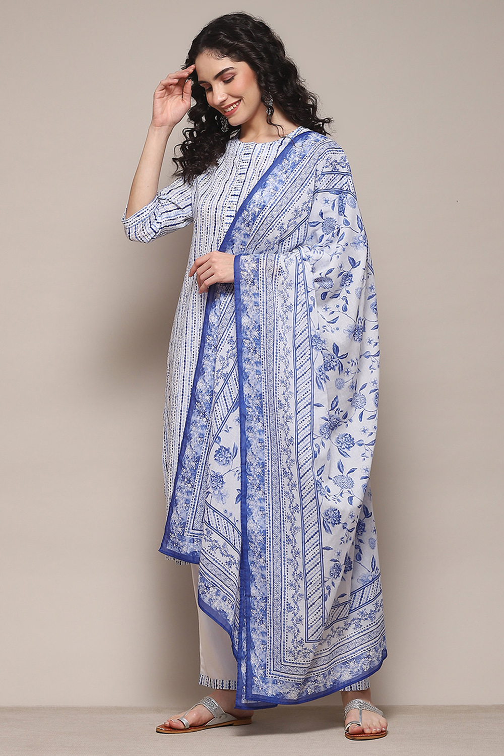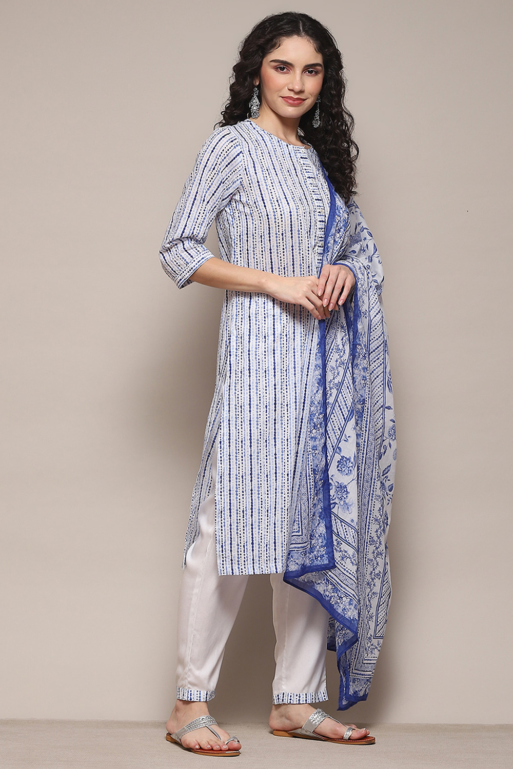 Casual chic white-blue cotton straight suit set with a floral dupatta for everyday style.