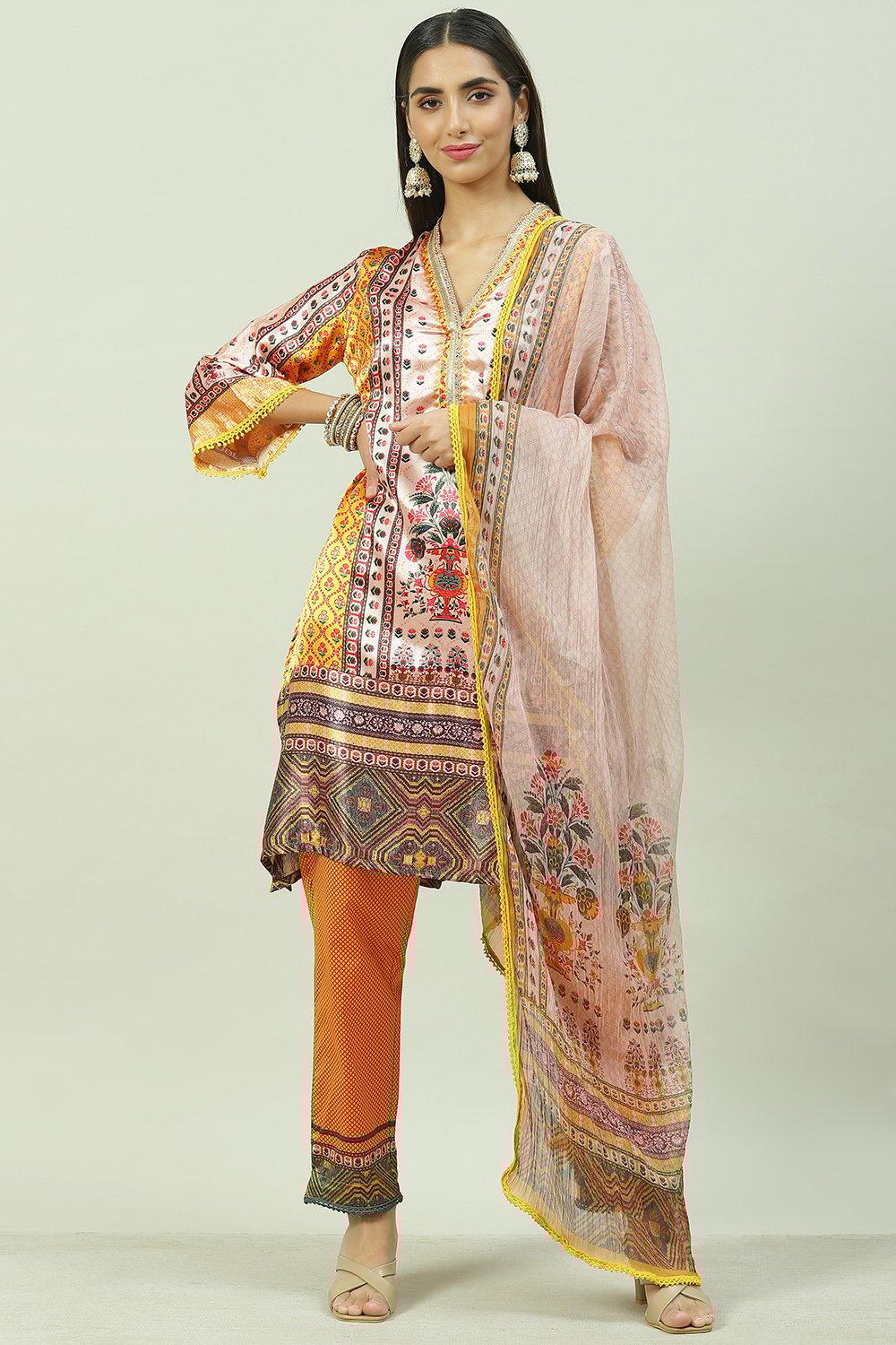 Immerse yourself in the festive spirit with this vibrant yellow silk blend straight kurta and slim pant suit set, an exquisite choice for women's festive wear. This 4-piece set includes a beautifully floral printed kurta, tailored slim pants, a coordinating dupatta, and a complementary Potli bag, offering a complete ensemble for any celebratory occasion. The silk viscose fabric ensures a luxurious feel and comfort, while the 3/4th sleeves and woven texture add sophistication to the design. Perfect for festivals or special events, accessorize with gold bangles and sandals to enhance the festive look.