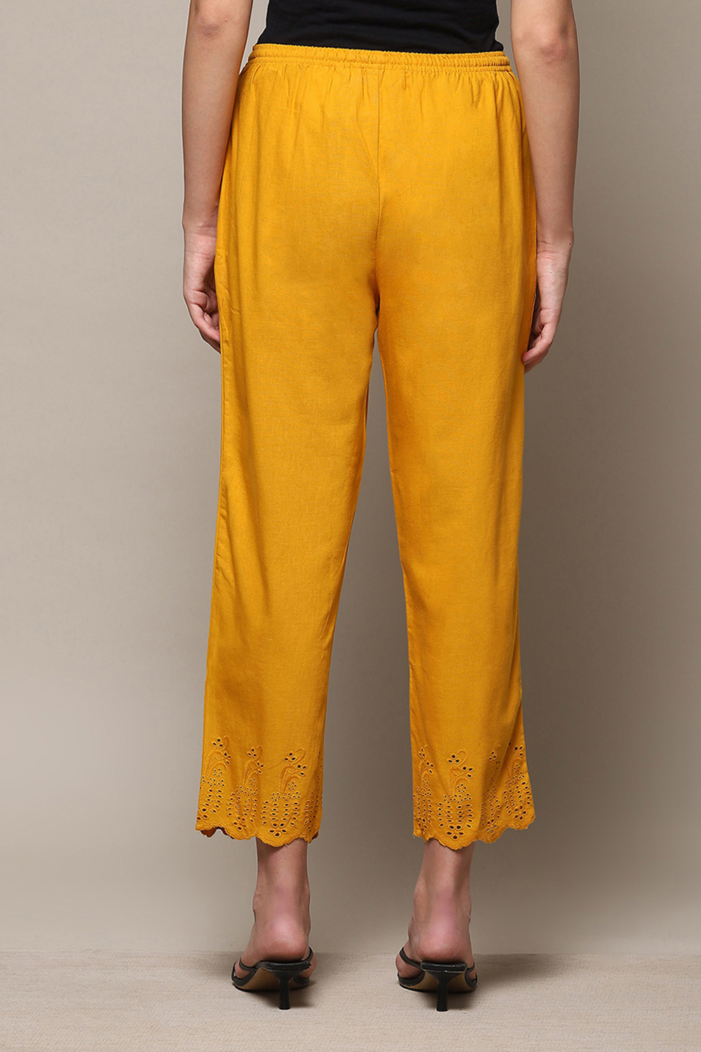 Add a touch of sunshine to your wardrobe with these Mustard Yellow narrow Pants. Crafted from Cotton Flax, they offer unparalleled comfort. Pair them with a printed top, accessorize with oxidized earrings, and finish off your ensemble with mules for a stylish look.