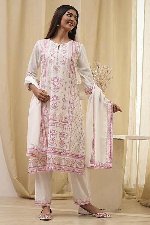 Off-White and Pink Cotton Straight Suit Set