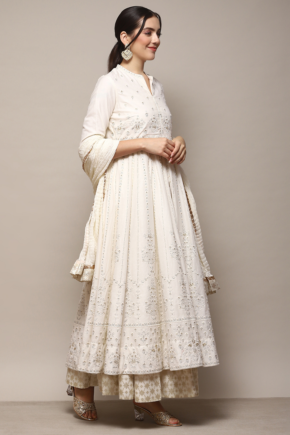 Elegant off-white cotton Anarkali suit set with embroidery, ideal for formal occasions.