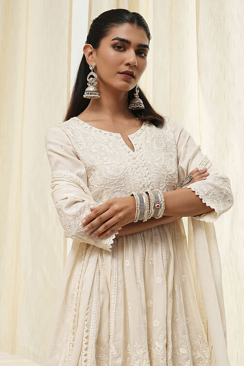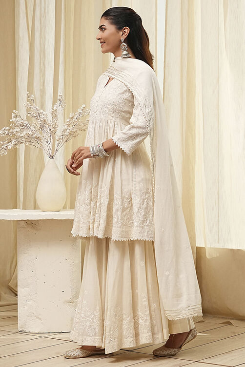 This off-white embroidered suit set, effortlessly blends modern elegance with unparalleled comfort, making it the ideal choice for women who seek grace on every occasion. Featuring a flared kurta, a matching garara, and a coordinating dupatta, this ensemble is crafted from lightweight cotton that offers breathability and a relaxed fit, ensuring comfort and ease of movement. Perfect for festive celebrations and intimate gatherings, it exudes effortless sophistication.