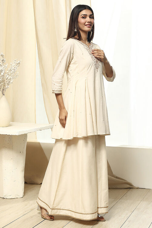 Step into timeless elegance with this exquisite off-white kalidar suit set, designed for women who seek the perfect blend of traditional charm and modern sophistication. This luxurious 3-piece set includes a kalidar kurta, a solid sharara, and a matching dupatta, making it an ideal choice for intimate gatherings and festive occasions, offering a refined and classy appearance.