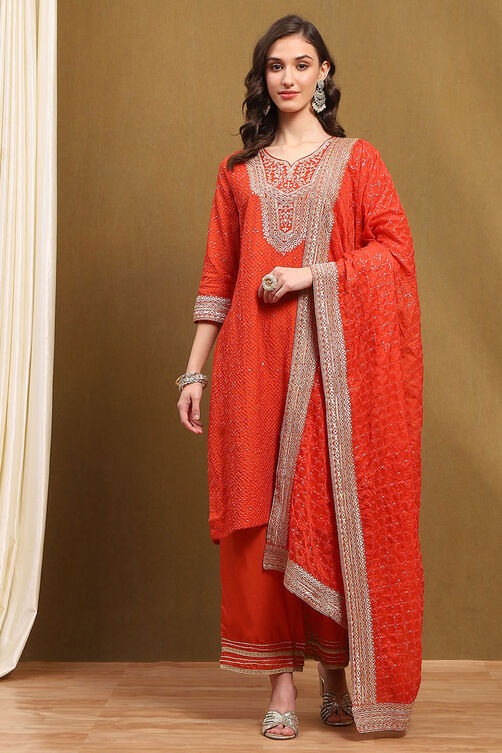 Experience the perfect fusion of elegance and individuality with our orange embroidered straight suit set, crafted for women who love to make a statement. Made from luxurious silk fabric, this ensemble features a straight-cut kurta, matching straight palazzos, and a coordinating dupatta, making it an ideal choice for festive occasions or intimate gatherings.
