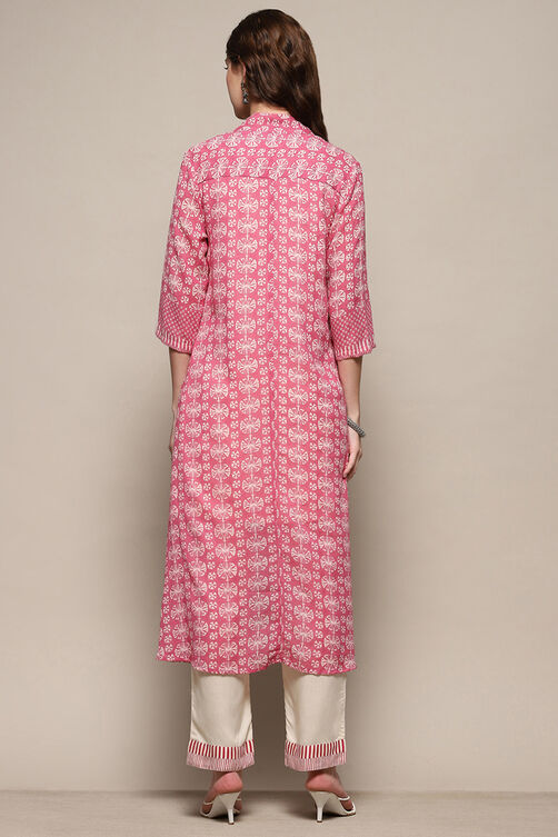 Embrace the ethereal charm of the pink and off-white printed kurta set, perfect for casual occasions that call for elegance. Crafted from breathable cotton fabric, this ensemble combines comfort with style, featuring a kurta, pants, and jacket for a complete look, ideal for breezy summer outings and parties.