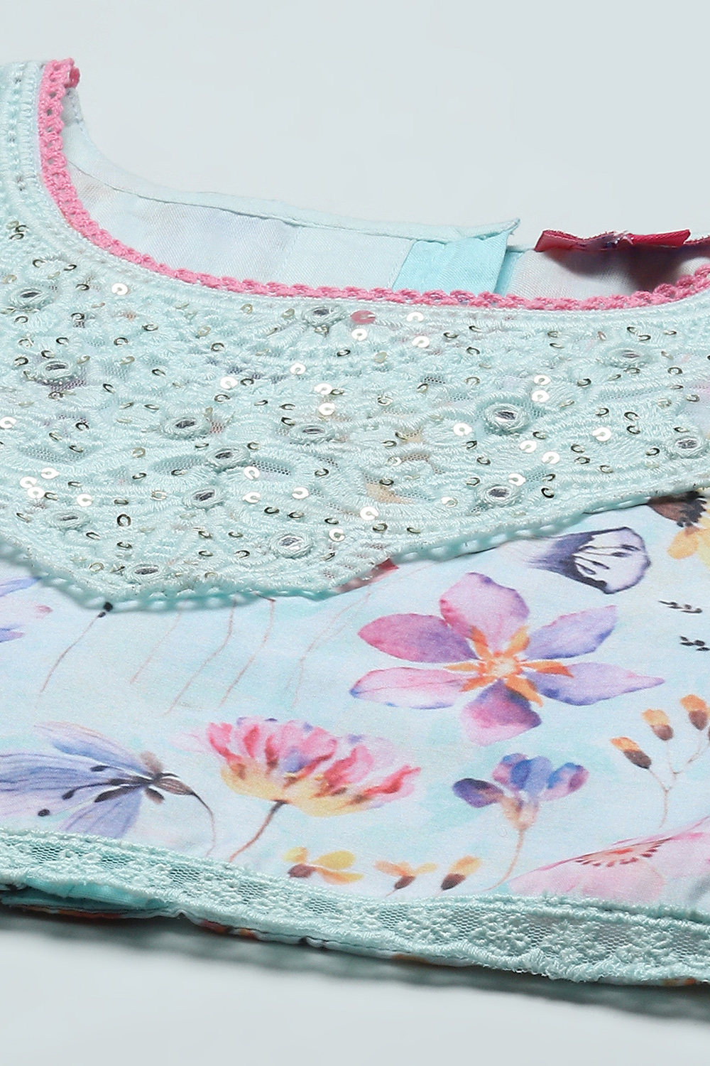 Let your girl shine with confidence & happiness in wedding festivities or parties with this straight polyester Lehenga Set. Floral Prints on the blouse enhance the whole outfit, the v-neckline gives comfort & gotta patti embellishment on the neck & hem takes the charm to another level, sleek & modern cap sleeves are in trend right now & will pop the whole outfit. The floral thread woven with sequin detail at the neck boasts poise. Sporting a straight shimmery lehenga with lining & an elasticated waistband and drawstring closure with tassels & a matching dupatta with taping on the borders. Pair it up with cute ballerinas or flats & chic bracelets for a classy finish