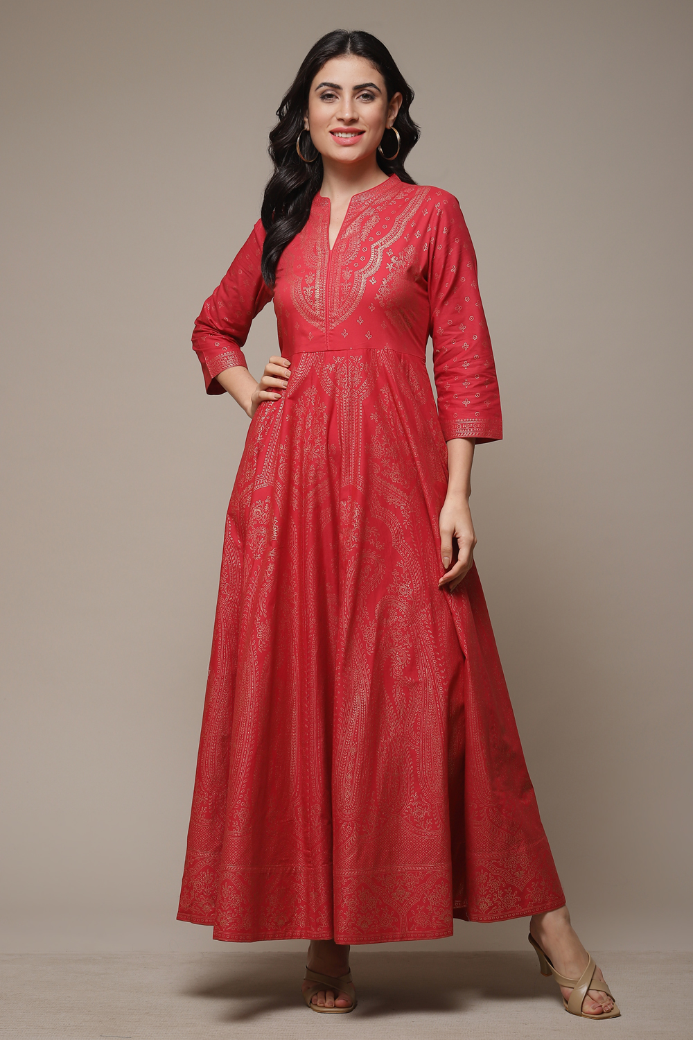 Uncover the beauty of this exceptional straight-printed dress, meticulously crafted from cotton. With its three-quarter sleeves, band collar neck, and stylish front slit, this dress is perfect for any grand celebration. Adorned with traditional prints all over, it exudes an elegant charm that is sure to captivate. Complete your ensemble with heels and accentuate the look with gold alloy earrings and bangles. Wash by hand in cold water using a gentle detergent.