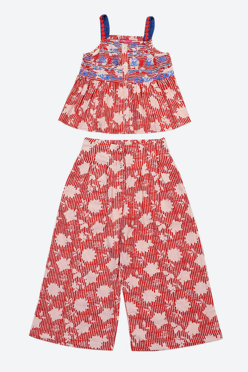 Red Printed Cotton Strappy Top and Flare Pants Set