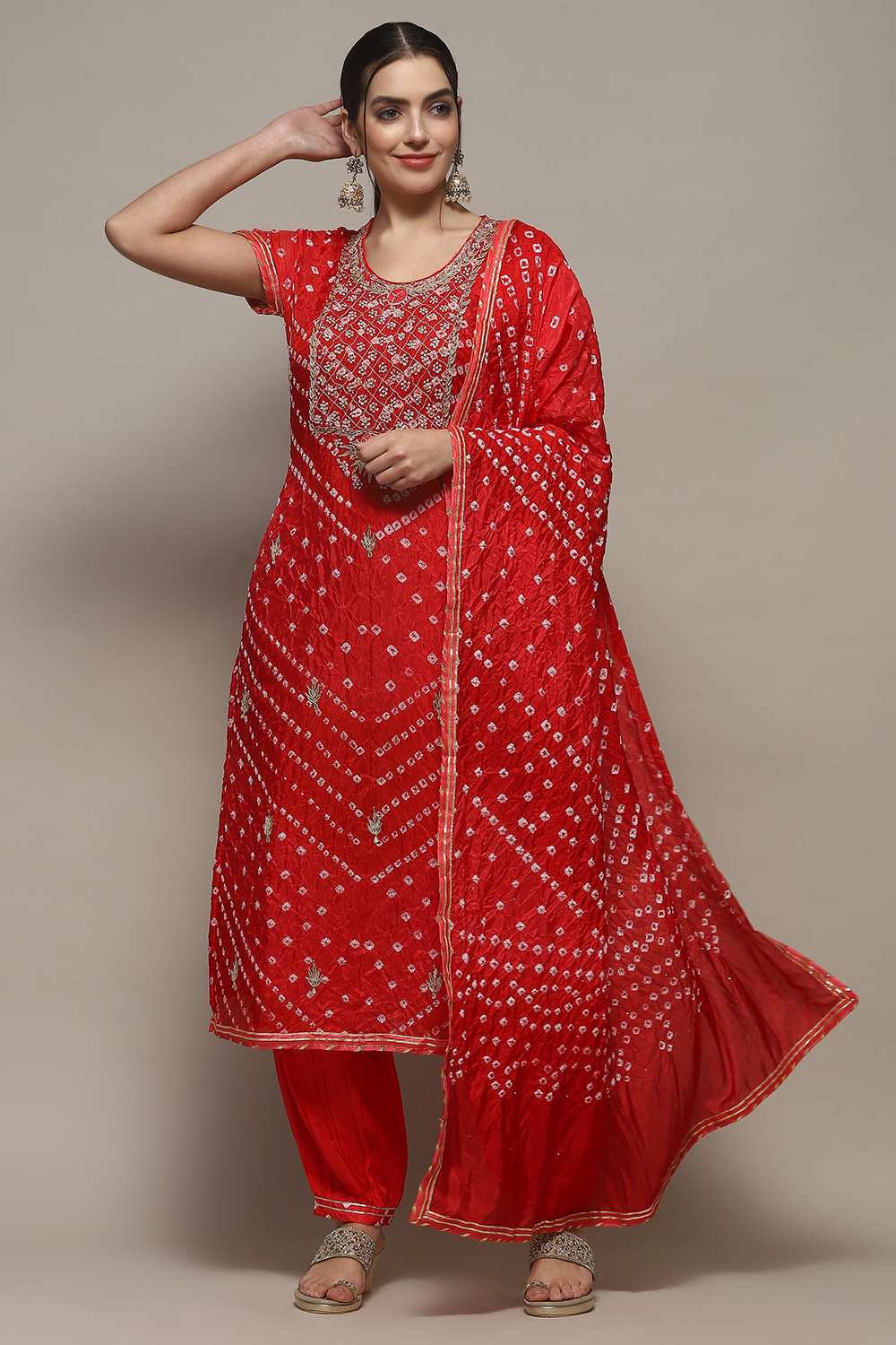 Embrace a vibrant and dynamic style with this red silk blend unstitched suit set, a must-have for women who love to make an impression. This ensemble, crafted from a luxurious silk blend, offers both elegance and comfort. It includes a kurta, bottom, and a dupatta, each piece adorned with an eye-catching tie-dye pattern that adds a contemporary edge to the classic red hue. The fluidity of the silk blend fabric ensures a graceful silhouette, making it perfect for festive occasions or evening events. Accessorize with silver statement jewelry and black heels to enhance the suit's boldness, creating a look that's both modern and timelessly chic.