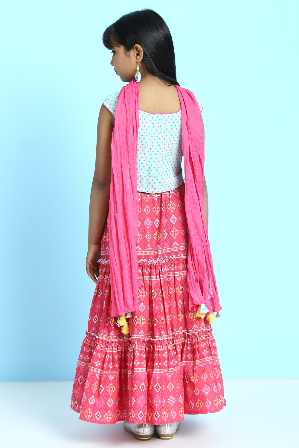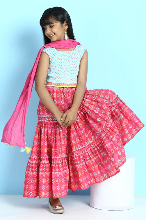This design mainly covers Biba’s summer season. In summer, when the temperature rises but your kid still wants to hold on to a lehenga choli for girls, you can offer her a cotton lehenga set. These come in print or embroidery. printed lehenga for girls are as famous as metallic lehenga choli for girls.