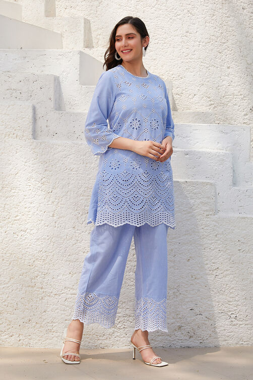 Sky Blue Cotton Schiffli Kurta & Palazzo Suit Set