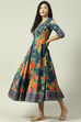 Go all out with bold floral prints this season. Our range of fusion dresses are easy breezy. This teal dress is made from pure cotton and features a flared silhouette. It has a round neckline and three forth sleeves. Style with silver jewellery for a bohemian look.