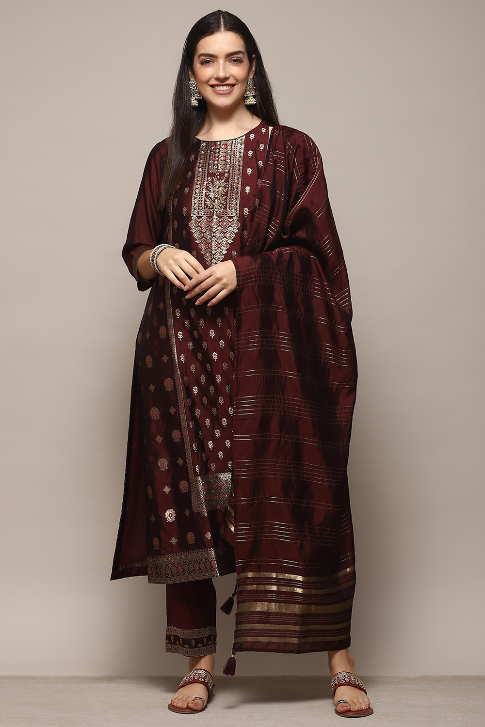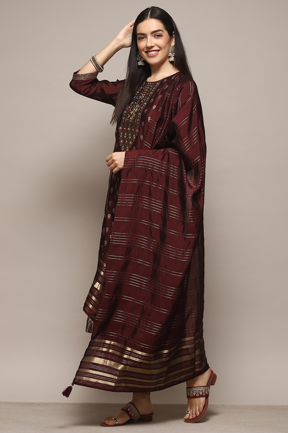 Wine Viscose Straight Yarndyed Kurta Regular Pants Suit Set