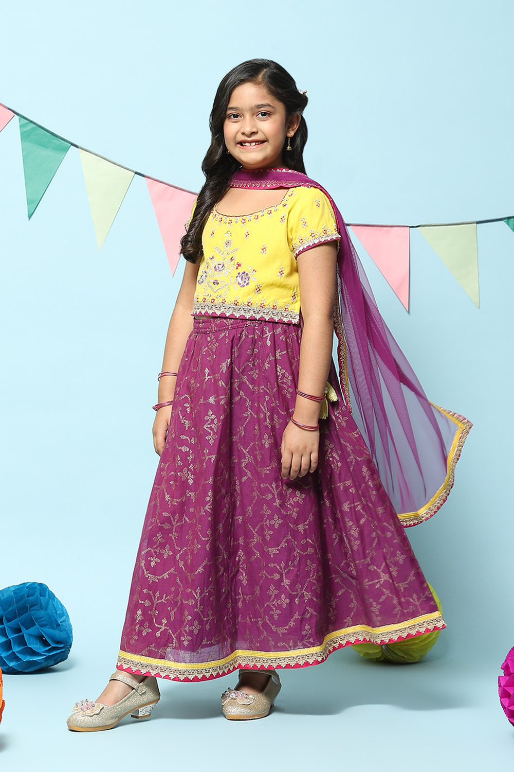 Marvel at your girl exuding confidence and style in this stunning polyester suit set. The top features cap sleeves and a round neck, adorned with exquisite embroidery work, beads, and ornamentation. The set includes a contrasting Lehenga with floral embellishments and a wide, designed border at the end. Completing the ensemble is a matching dupatta with the same lace attached at the end.