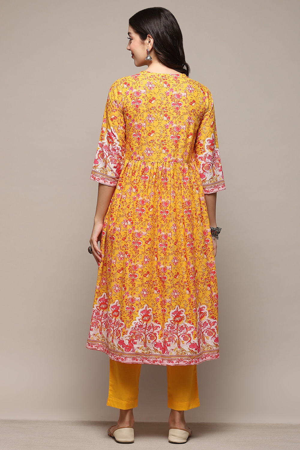 Upgrade your casual wardrobe with the Yellow Kurta Pant Suit Set. This 2-piece set combines comfort with style, making it ideal for your everyday outings. Crafted from fine cotton cambric, the kurta features a flattering flared silhouette and a round neckline. The intricate print adds a touch of uniqueness to the ensemble. Paired with comfortable pants, this set is perfect for a casual yet chic look. The 3/4th sleeves provide ease of movement and style. Whether you're heading out for a casual gathering or a day at the office, this suit set is a versatile addition to your wardrobe. Add some colorful accessories to complete your look.